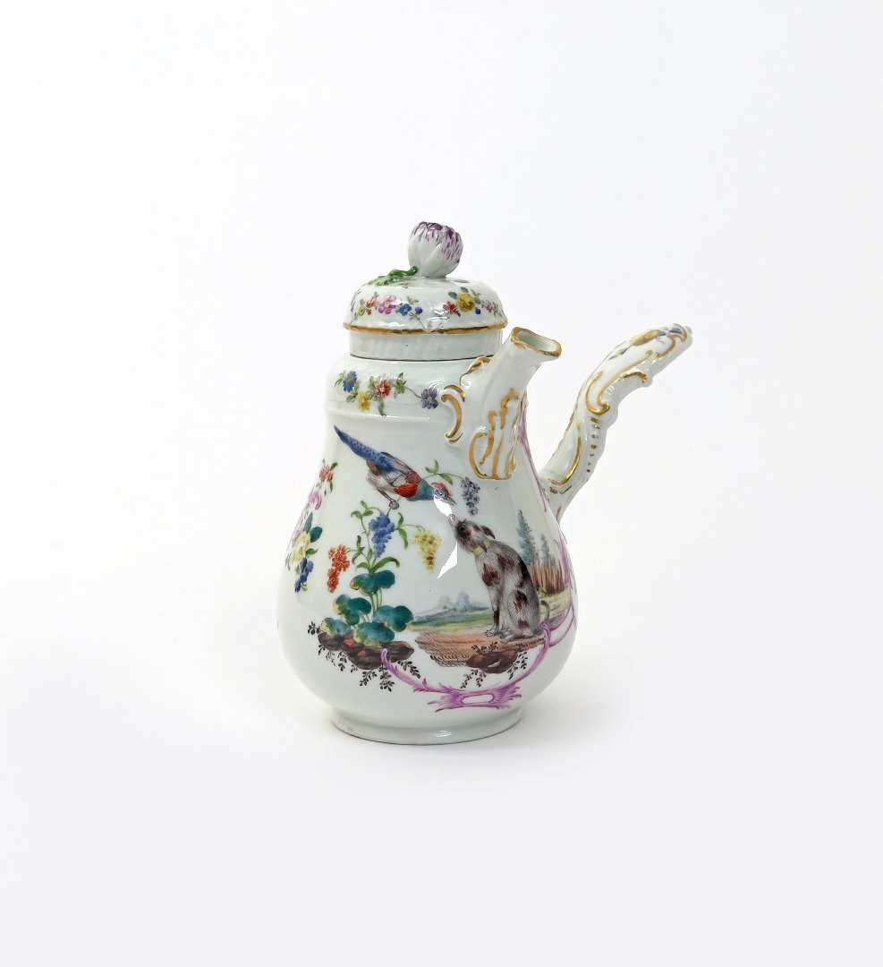 A Meissen chocolate pot and cover c.1755, the pear-shaped body painted beneath the spout with a dog seated on its haunches and gazing up reproachfully at a colourful bird perched above its head, the reverse with a rabbit boxing the long tail of a bright parrot, with scroll moulded side handle, blue crossed swords mark, 15.2cm. (2)