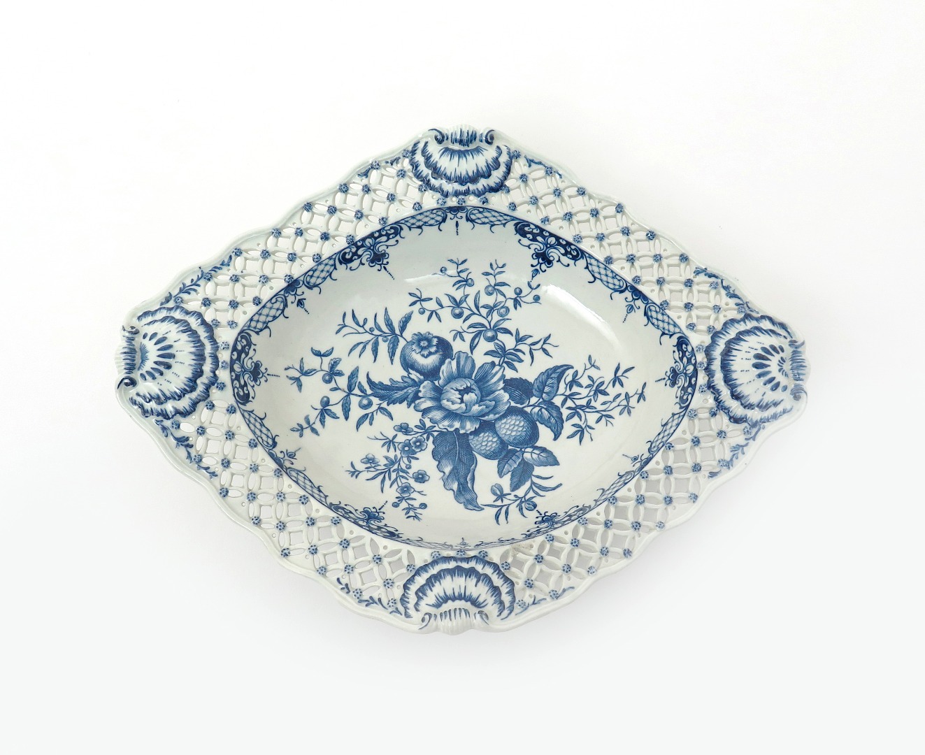 A rare Worcester blue and white dessert basket c.1770-75, the lozenge shape dish printed with the Pinecone pattern, the rim with four shell motifs between elaborately pierced panels with tiny blue flowerheads, hatched crescent mark, some good restoration, 31.6cm.