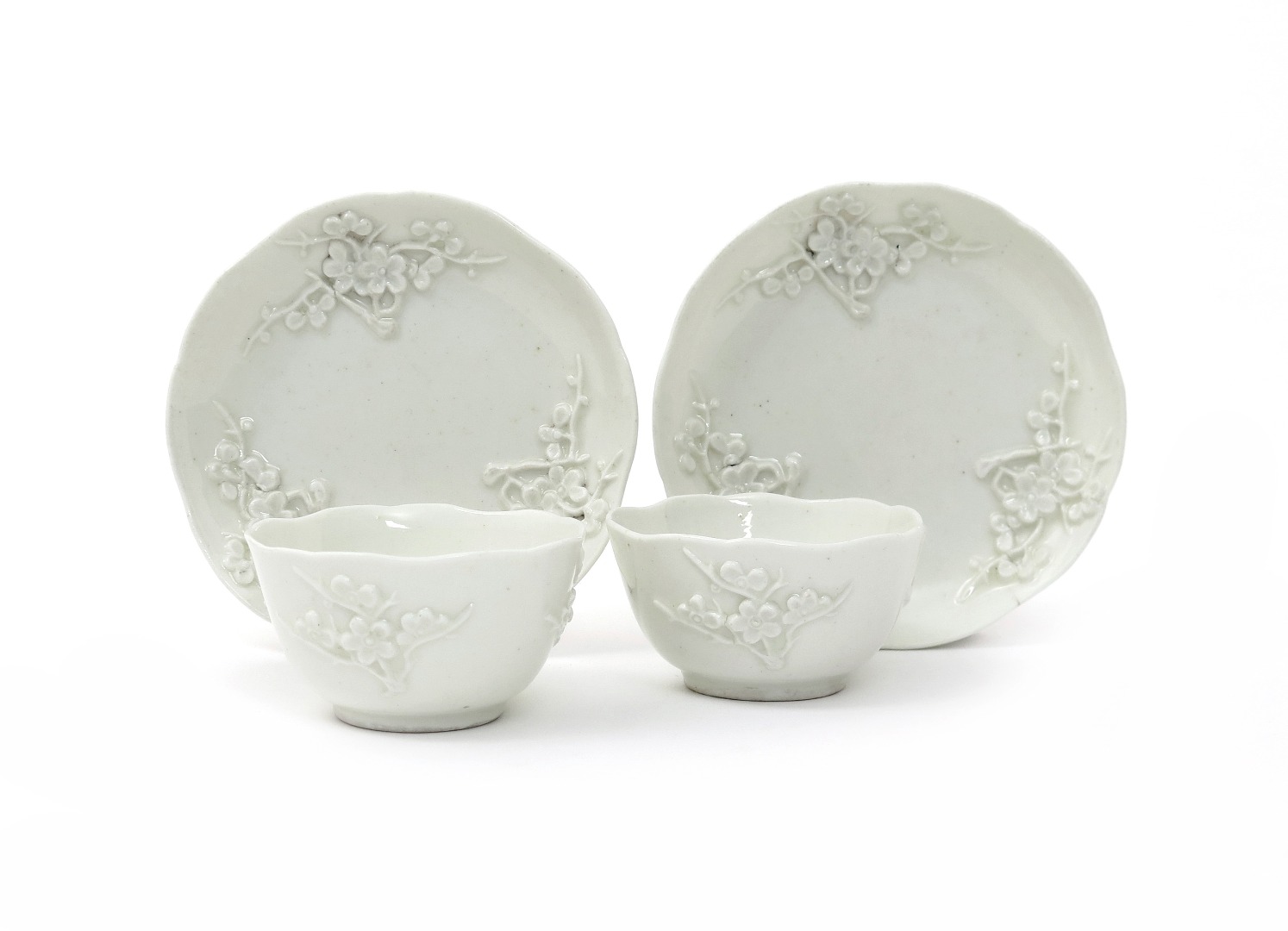 A pair of Bow white-glazed teabowls and saucers c.1755-58, with shaped rims, each applied with three sprigs of flowering prunus, a short crack to one saucer, 11.4cm. (4)