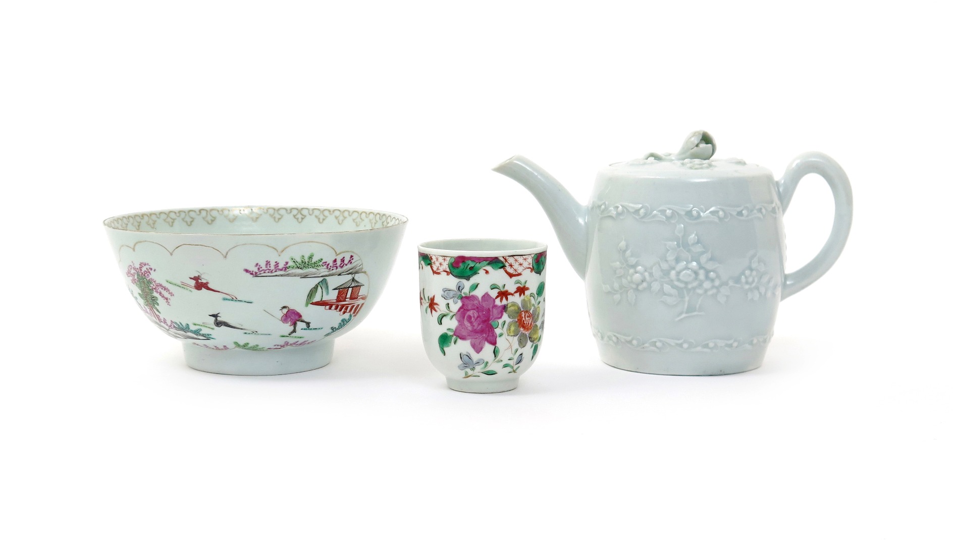A Worcester moulded teapot and cover c.1770, the barrel form moulded with flower sprays within continuous foliate bands, left in the white, a Worcester coffee cup with polychrome flower decoration, and a slop bowl painted with the Stag Hunt pattern, some restoration to the bowl, 18cm max. (4)