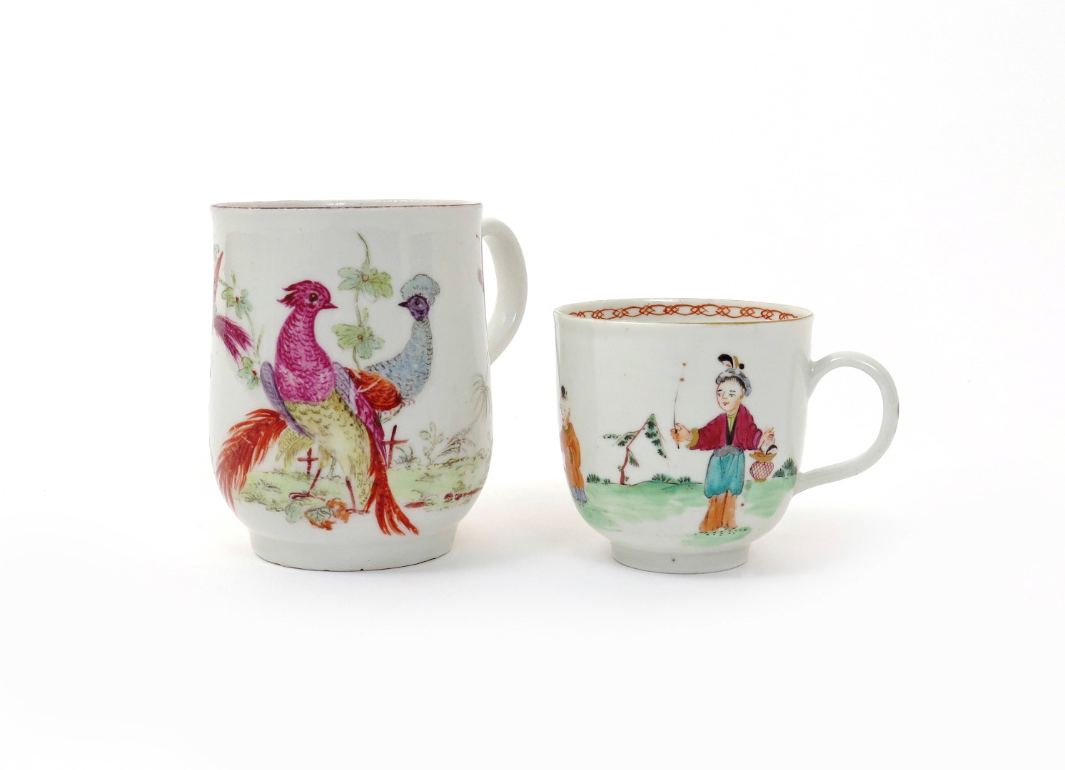 A Bow bell-shaped mug c.1770, painted in polychrome enamels with colourful birds, a large moth and a grasshopper, and a Bristol coffee cup painted with three Chinese figures standing in a garden and holding various attributes, a red chain border to the interior rim, the mug with a stained crack, 9cm max. (2)