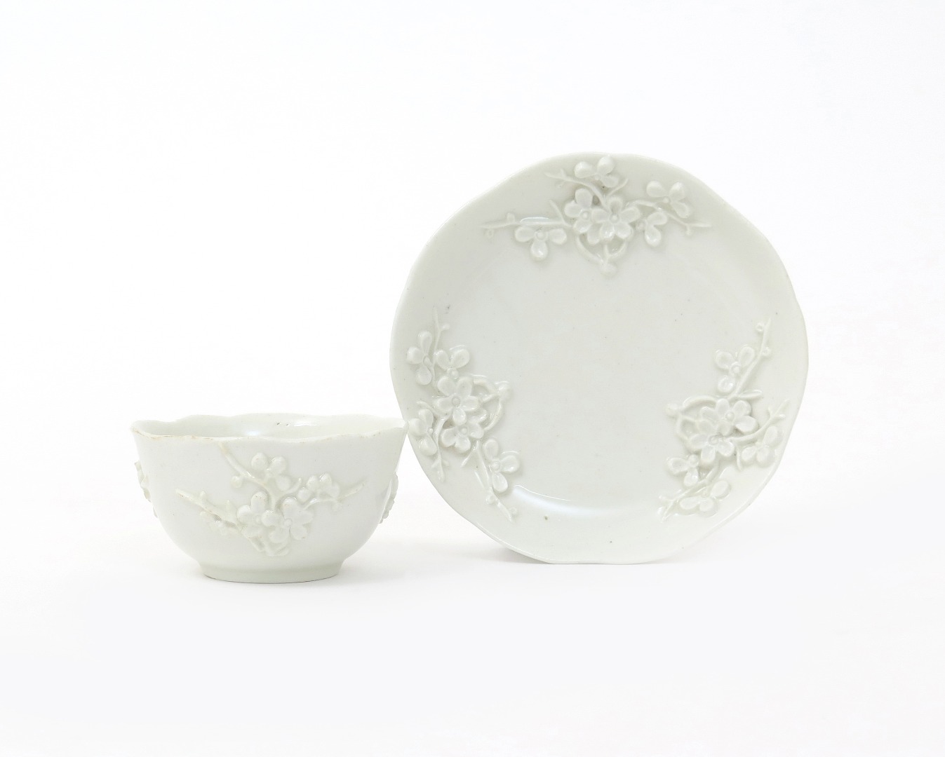 A Bow white-glazed teabowl and saucer c.1756, applied with sprigs of flowering prunus, within shaped rims, 11.6cm. (2)