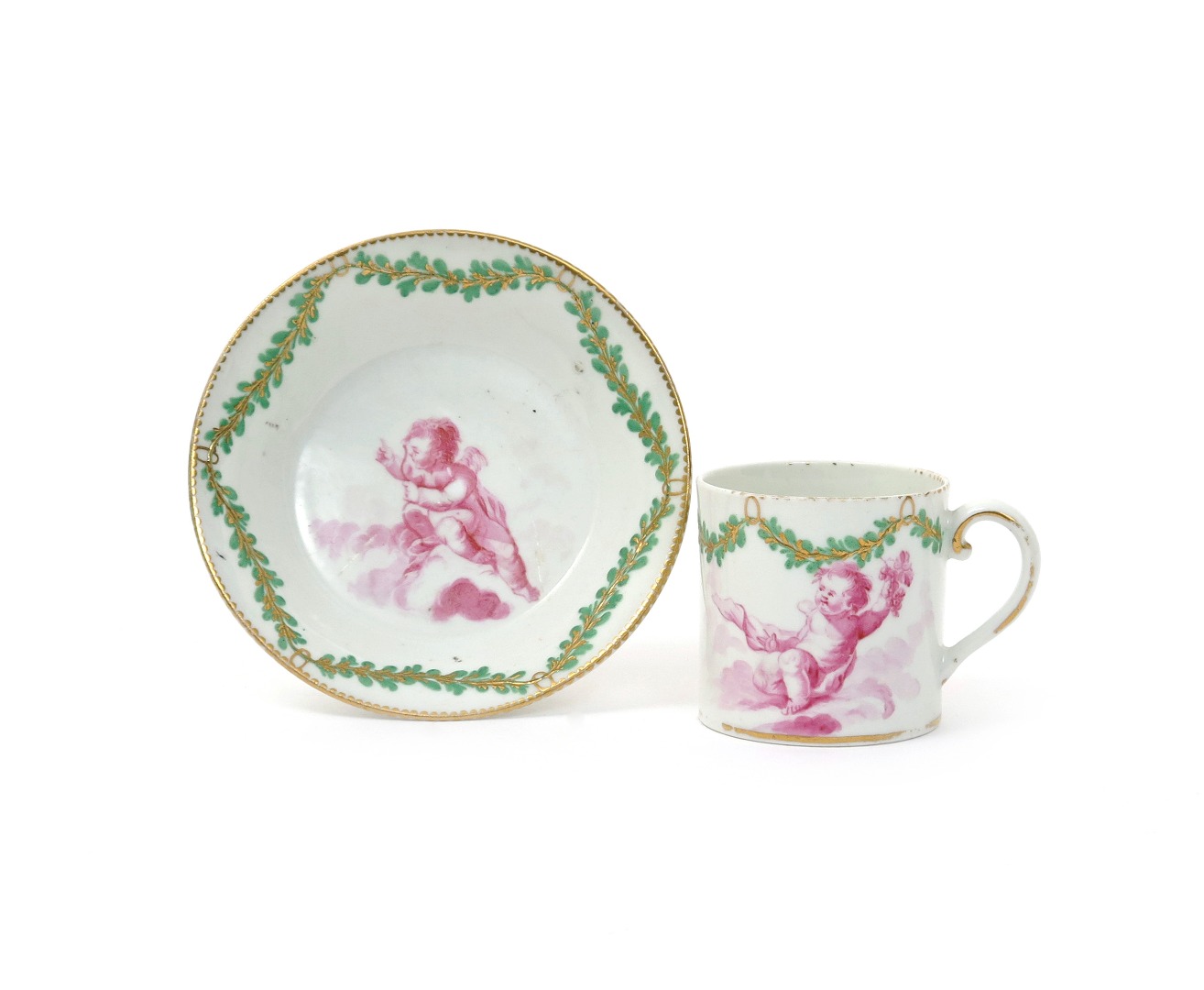 A Chelsea-Derby coffee can and saucer c.1775, painted in puce monochrome, probably by Richard Askew with scenes of putti seated on clouds, the rims with green and gilt leaf swags, the saucer with a gilt anchor and D mark, a small chip to the can, 11.2cm. (2)