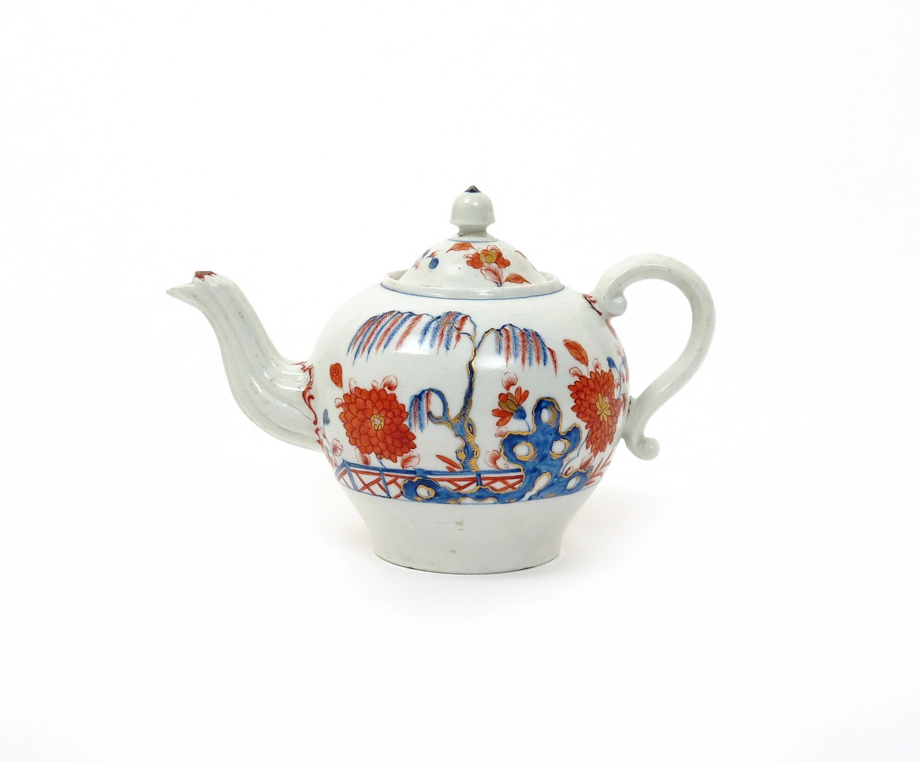 A rare Derby teapot and cover c.1756, decorated in the Imari palette with flowering chrysanthemum and holey rockwork beneath weeping willow, the reverse with chrysanthemum and rockwork, the reeded spout formed as a mythical beast, the cover broken and repaired, 19.5cm. (2)