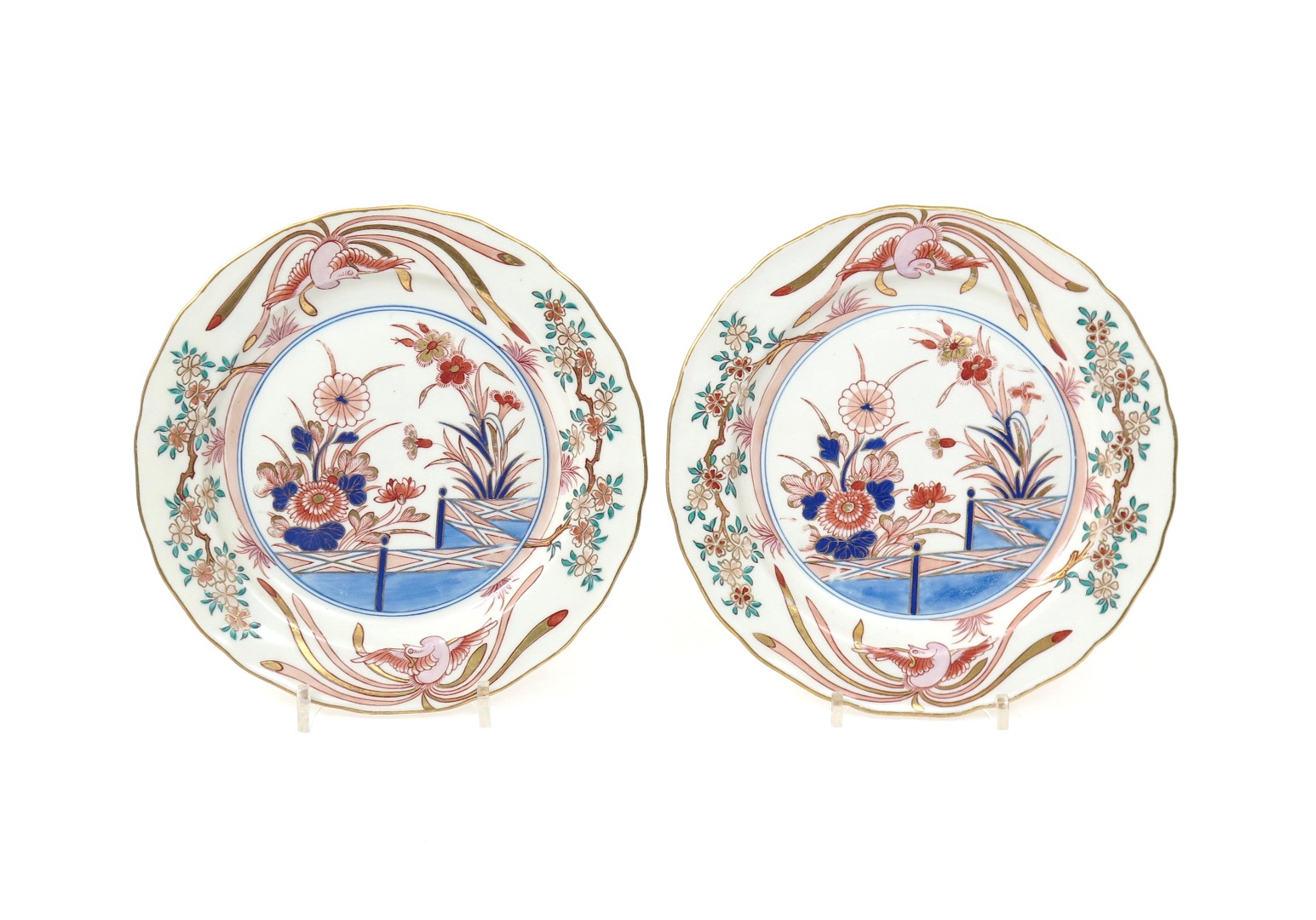 A pair of Derby plates late 18th/early 19th century, copying the Japanese with chrysanthemum and other flower sprays issuing from a zigzag fence in the Imari palette, the rims with long-tailed birds and sprays of flowering prunus, 22cm. (2)