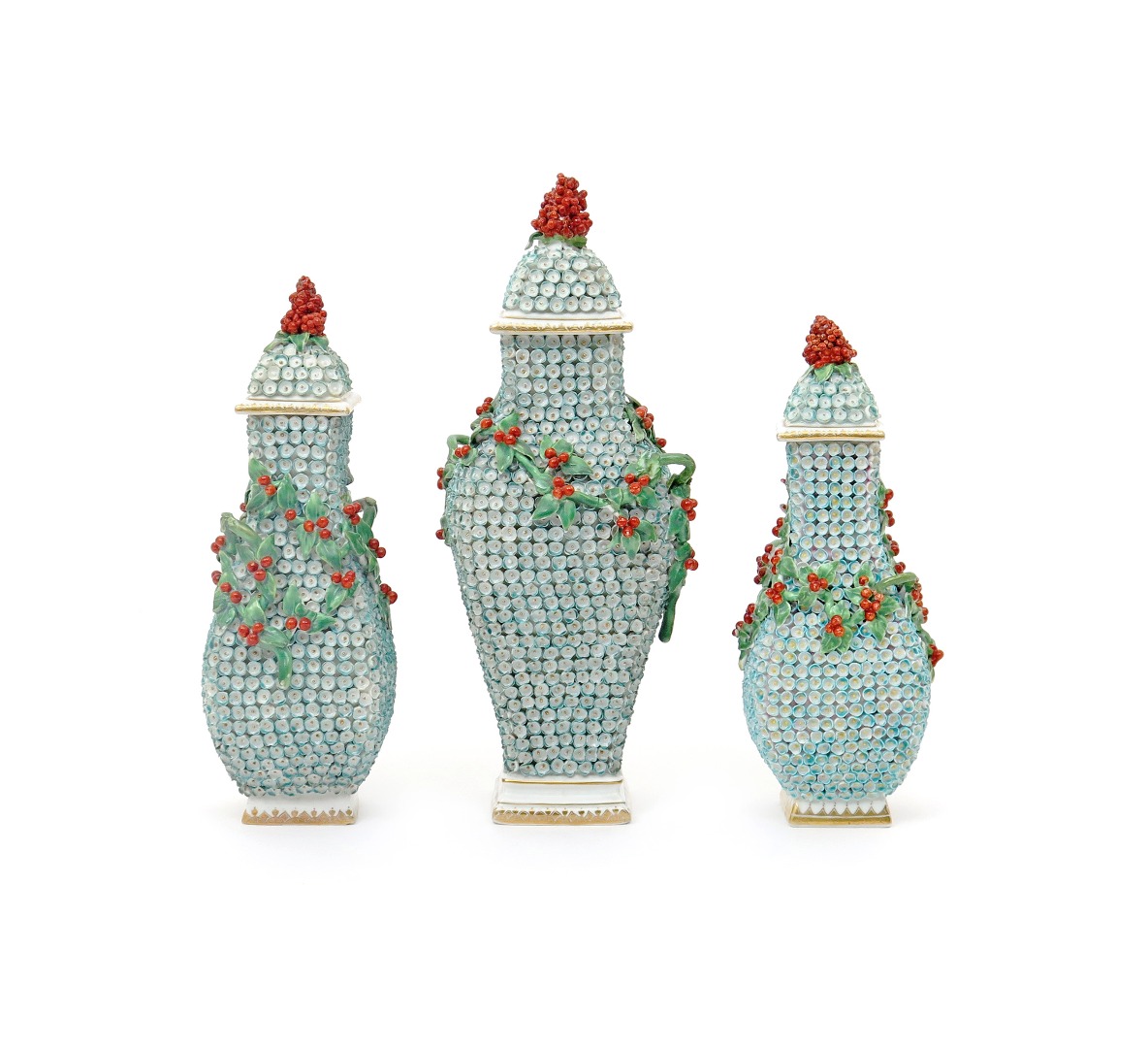 A garniture of three Derby 'Mayflower' vases and covers c.1770-75, of square baluster form, decorated in the Meissen schneeballen style with closely packed flowerheads edged in turquoise with gilt stamen, the shoulders applied with leafy tendrils bearing clusters of red berries, the covers with tall berry finials, some damages, 28.5cm max. (6)