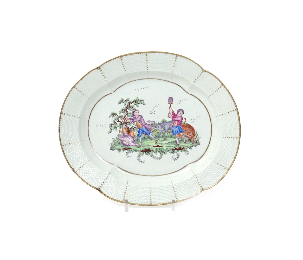 A Worcester dessert dish c.1775, painted probably in a London atelier with a scene in the manner of David Teniers, three children being attacked by a stag and a wild boar, the quatrelobed rim with osier moulding and gilt detailing, 29.7cm.