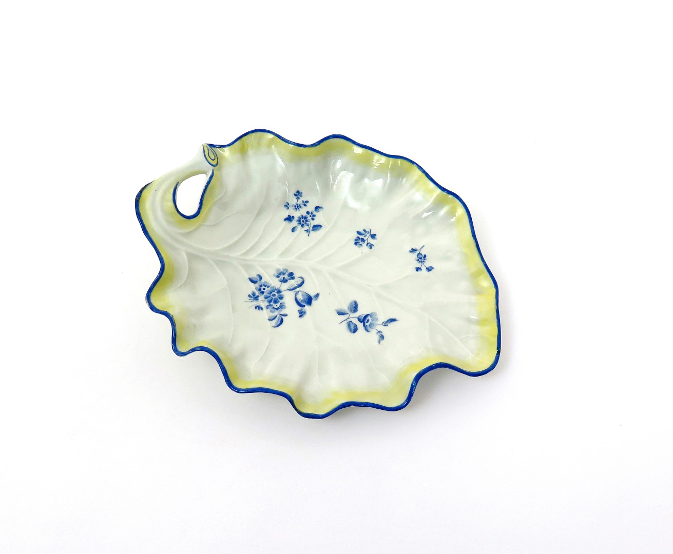 A Worcester leaf dish c.1770-75, naturalistically moulded with undulating rim, the curved stalk forming the handle, painted in the atelier of James Giles with sprigs of dry blue flowers, the rim tinged yellow within a blue line, some restoration to the rim, 21.3cm.