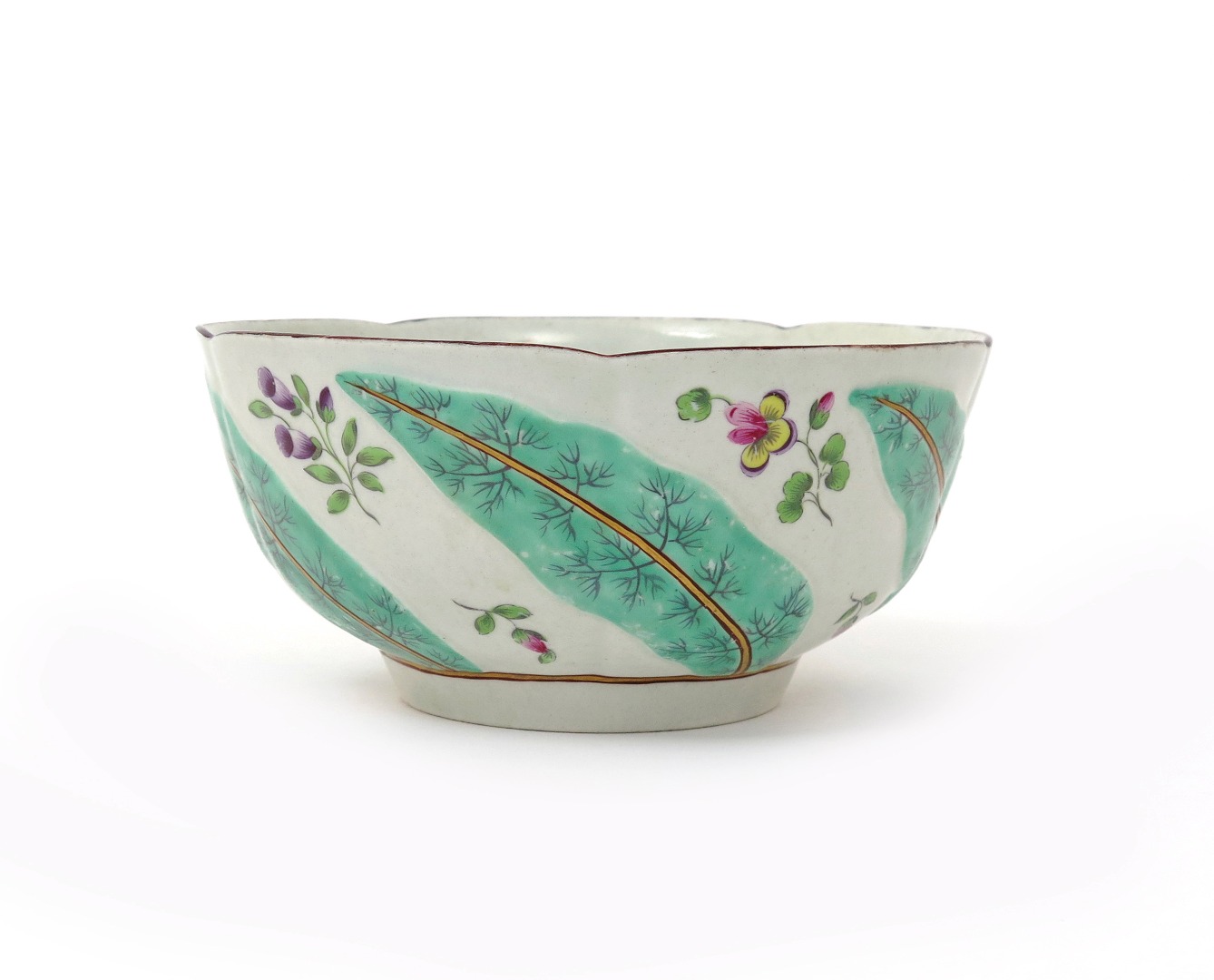A rare Worcester Scolopendrium bowl c.1772-75, the cinquefoil form moulded with large spiralled scolopendrium leaves, amidst small painted floral sprigs, brown line rim, a small restored rim chip, 15.3cm.