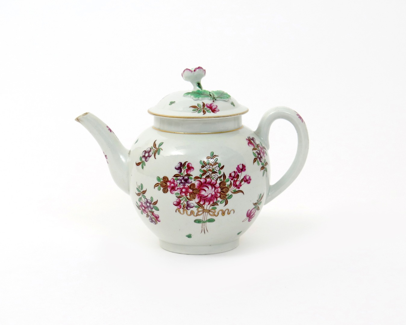 A Worcester teapot and cover c.1770-75, painted with flowers in the Compagnie des Indes manner, in a palette of pink, purple, brown, green and gilt, a short crack to the end of the spout, 18.5cm. (2)