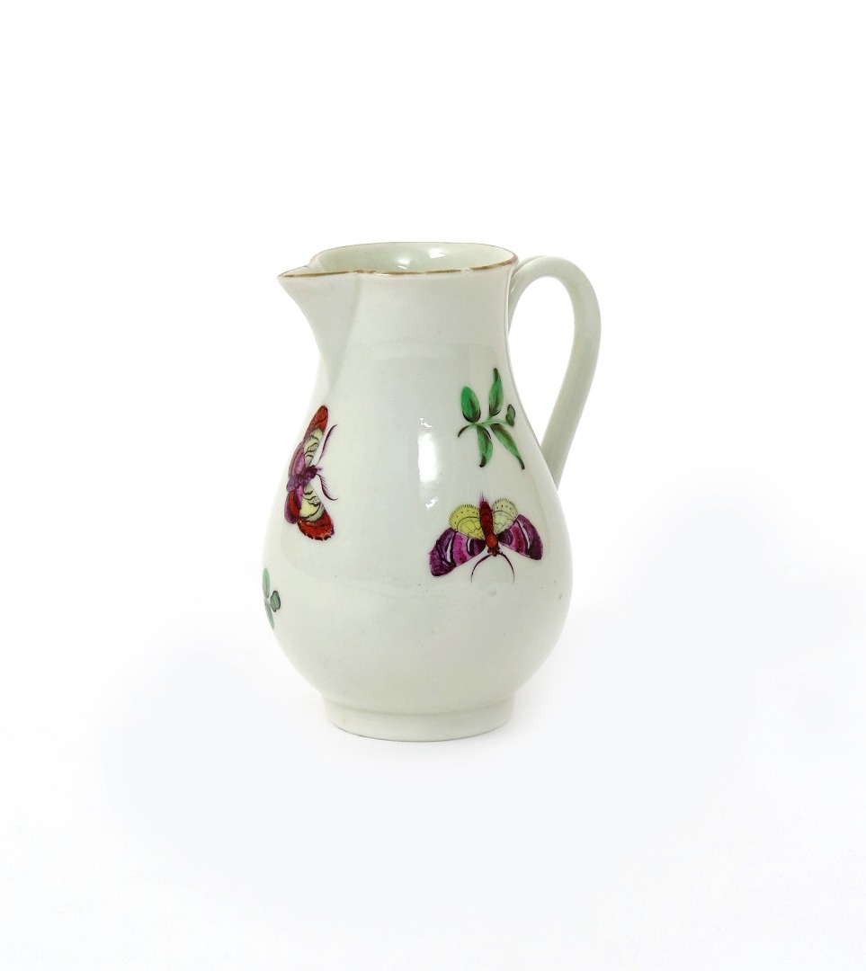 A Worcester milk jug c.1760, brightly enamelled with three large moths amidst scattered green leaves, 9.8cm high.