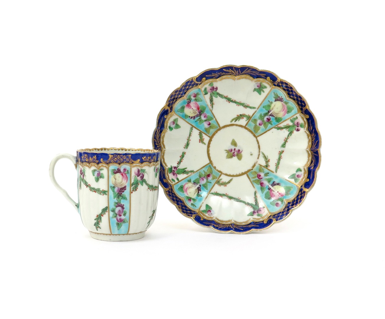 A Worcester coffee cup and saucer c.1775-80, the fluted forms painted with berried leaf swags around four panels of spotted fruit on a turquoise ground, the rims with gilt foliate sprays and diaper panels on a rich blue ground, script W marks, some restoration to the rim of the saucer, 13.5cm. (2)