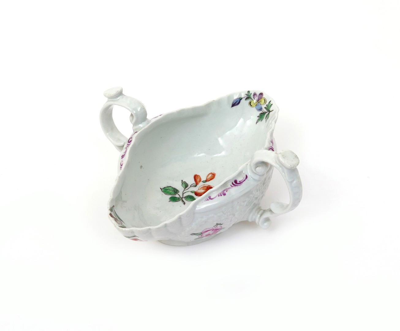A good Worcester two-handled sauceboat c.1758, moulded to the exterior with four floral panels containing single polychrome flower stems, echoed to both sides of the shell spouts, the interior with a larger spray, above the handles with puce scroll detailing, 18.8cm.