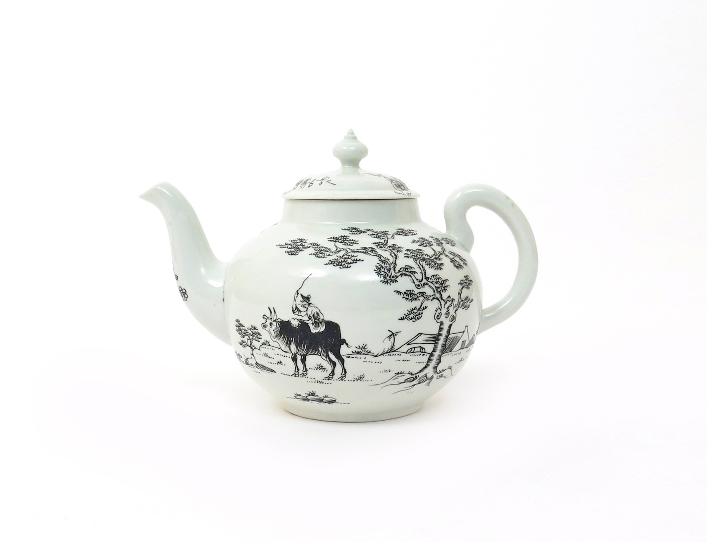 A Worcester teapot and cover c.1755-57, of slightly compressed globular shape, pencilled in black with the Boy on a Buffalo pattern, the youngster astride his placid bovine mount, the reverse with a bird in flight above another buffalo and two sampans, incised mark to the base, a small chip to the cover, 19cm. (2)