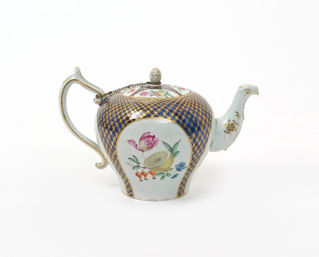 A rare John Pennington (Liverpool) teapot and cover c.1775, the inverted pear-shape body painted in the atelier of James Giles with panels of fruit and flowers reserved on a blue and gilt ground, the spout formed as the head of a mythical beast, the cover's finial attached to the handle with a gilt metal chain, 21cm. (2)