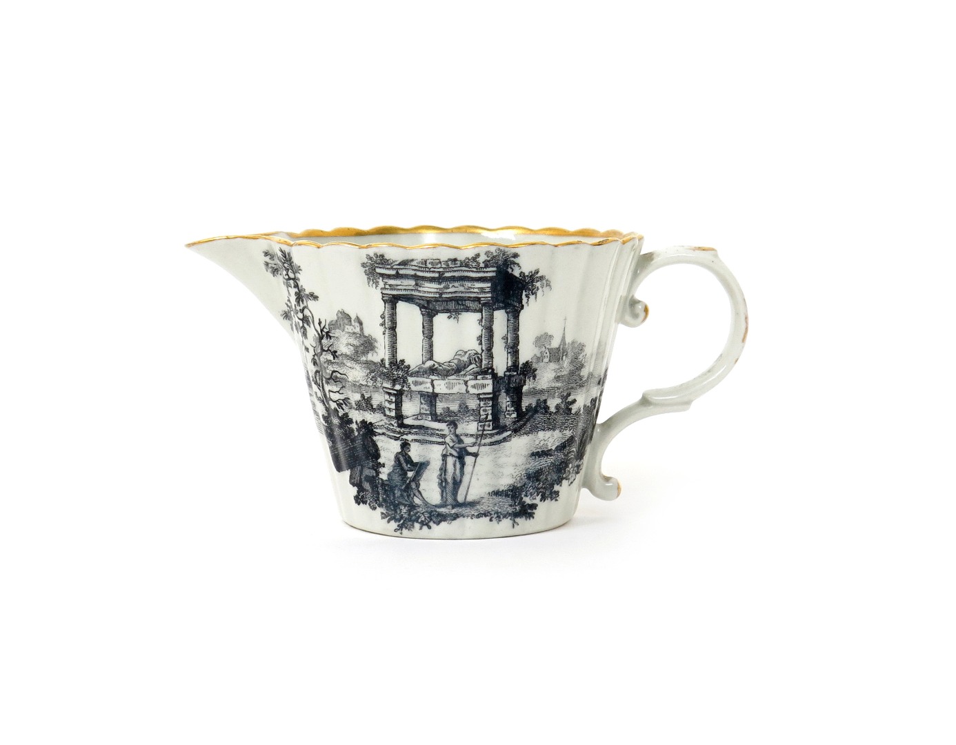 A Worcester fluted milk jug c.1775, the flared bucket-shaped body printed in black with figures among ruined Classical temples, the interior with a rural scene, gilt line rim, 14cm across.