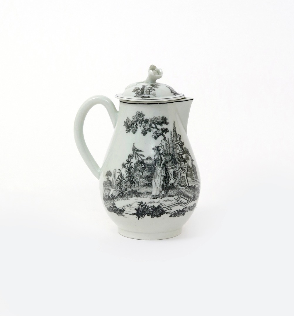 A Worcester jug and cover c.1770, printed in black with L'Amour to one side and Lady Watering Garden to the reverse, the cover with three small landscape vignettes around the floral finial, 13.5cm. (2)