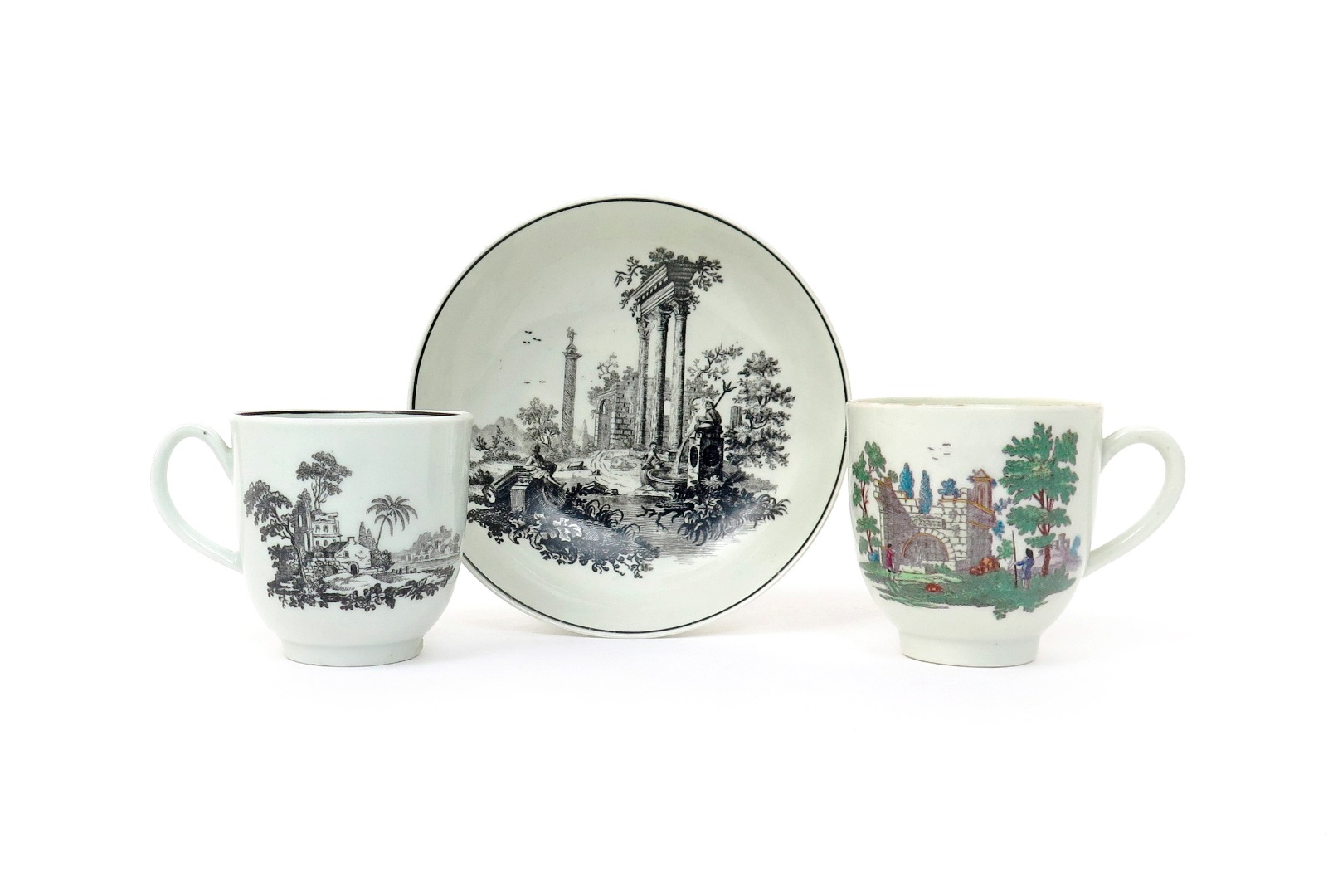 A Worcester coffee cup and saucer c.1765-70, printed in black with differing scenes of figures beside Classical ruins, and a further coffee cup printed and hand-coloured with similar scenes, 12.2cm max. (3)