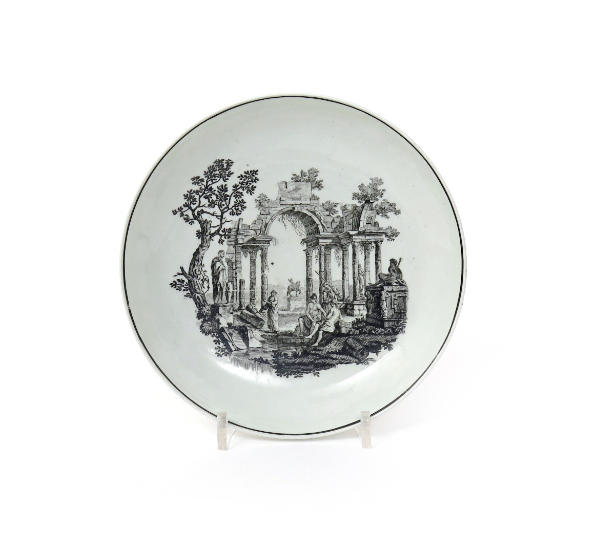 A Worcester saucer dish c.1765, printed in black with figures beneath a ruined archway before a statue of Marcus Aurelius, 18.5cm.
