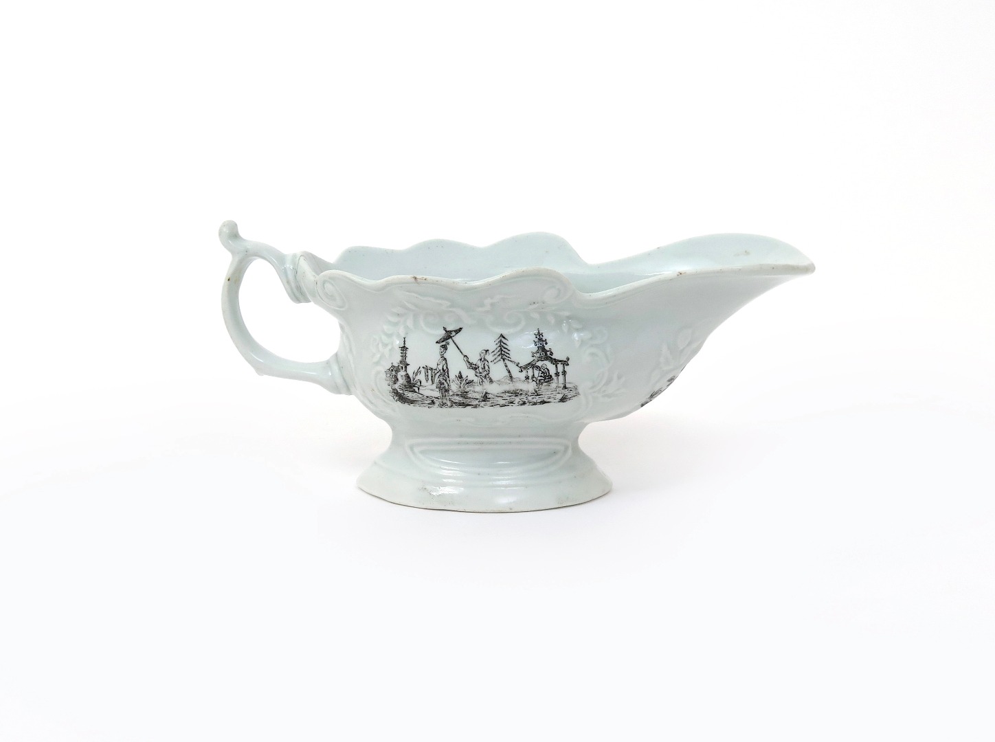 A rare Worcester high footed sauceboat c.1754-55, each side with a rococo moulded panel, printed in black in the 'Smoky Primitive' manner with chinoiserie scenes of figures with parasols and a Buddha in a temple, the interior with a European figure seated beside a Classical urn and blowing bubbles, some damages, 19.5cm across.