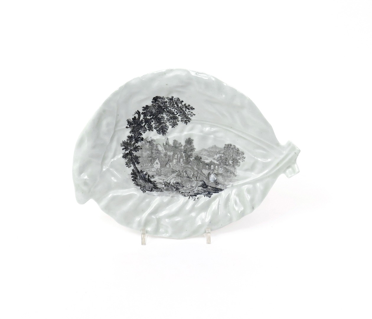A Worcester leaf-shaped dish c.1760-65, printed in two tones of black with figures in a rural landscape, crossing an arched bridge, fishing from the riverbank, and promenading before buildings, framed to one side by a tall curved tree, 26.7cm.