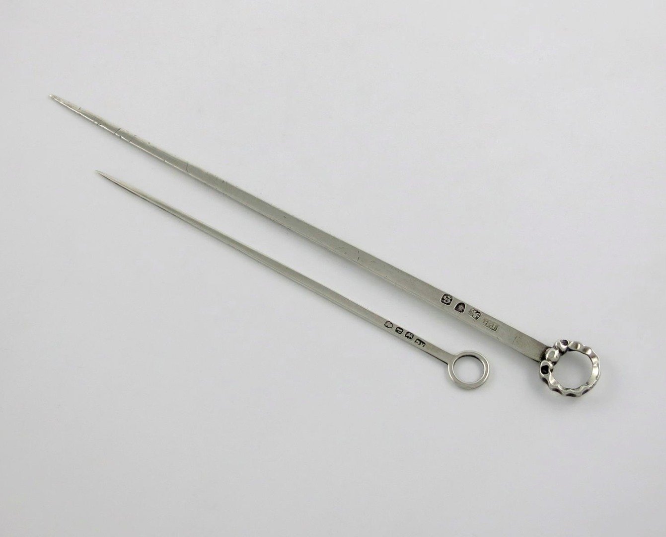 plain tapering form, ring terminals, length 15.8cm, approx. weight 0.5oz. (2)