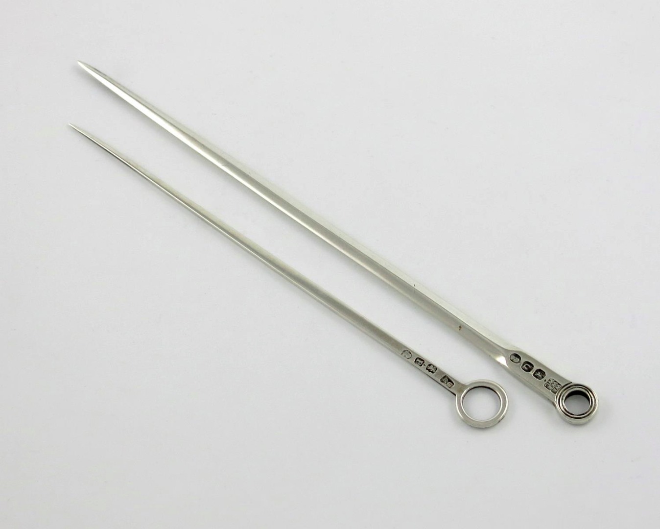 by Thomas Harrison, London 1773, tapering form, textured ring terminal, plus a George III silver poultry skewer, by Eley, Fearn and Chawner, London 1811, reeded ring handle, approx. total weight 1.3oz. (2)