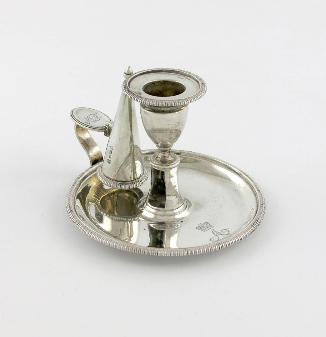 circular form, gadroon borders, with a conical snuffer, engraved with a monogram and crowned 'A', diameter 12.5cm, approx. weight 7.4oz.