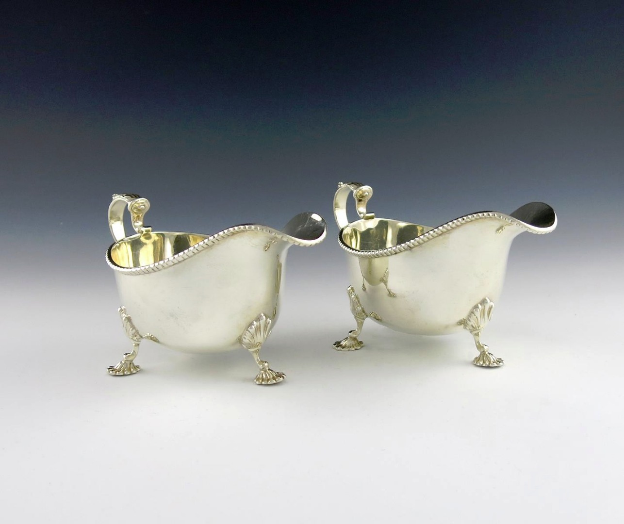 oval form, leaf capped scroll handle, gadroon border, on three shell mounted scroll and pad feet, length 16.7cm, approx. weight 12.5oz. (2)