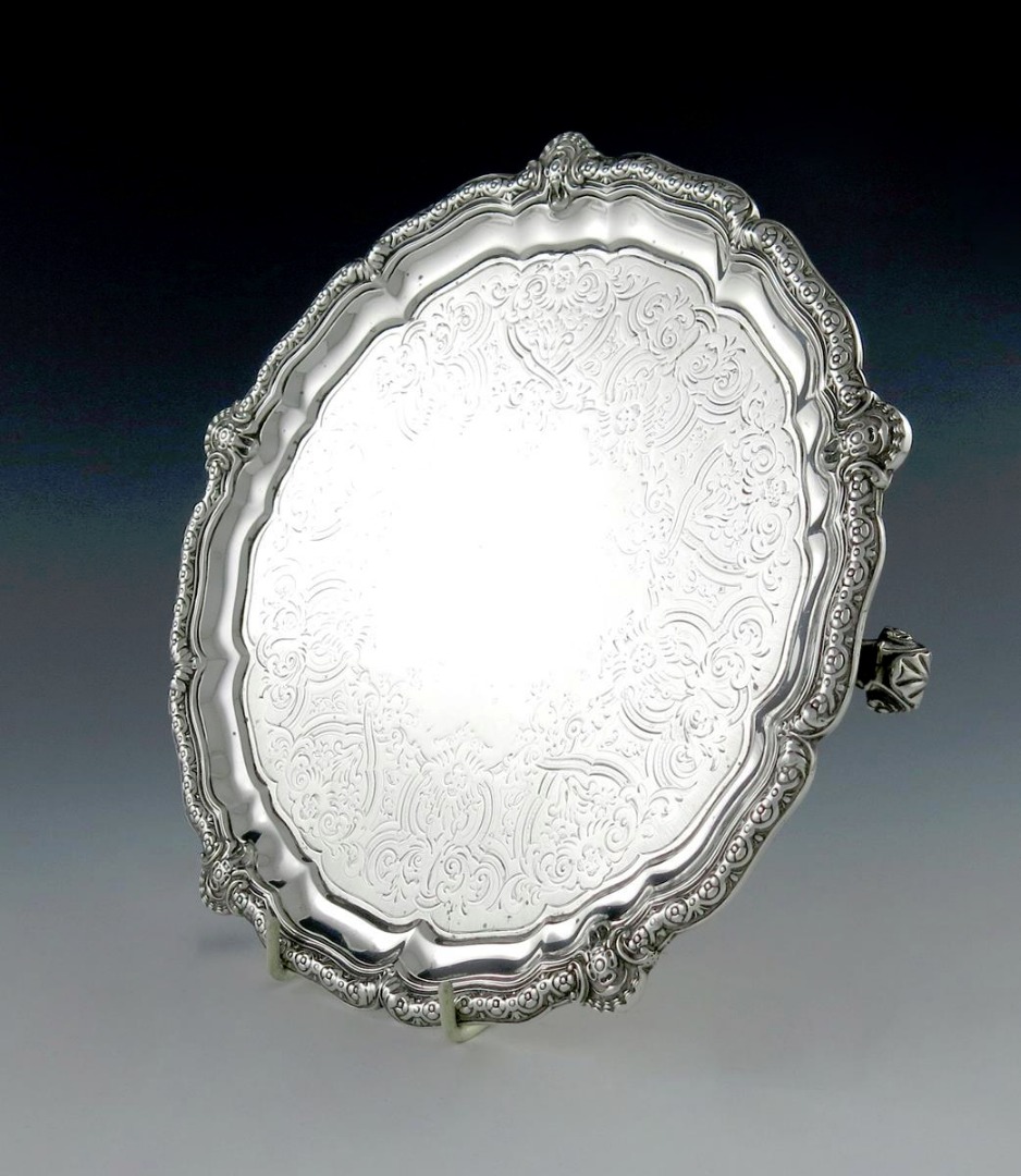 circular form, stylised border, the centre chased with foliate scroll decoration, on three gnarl feet, diameter 24.3cm, approx. weight 20oz.