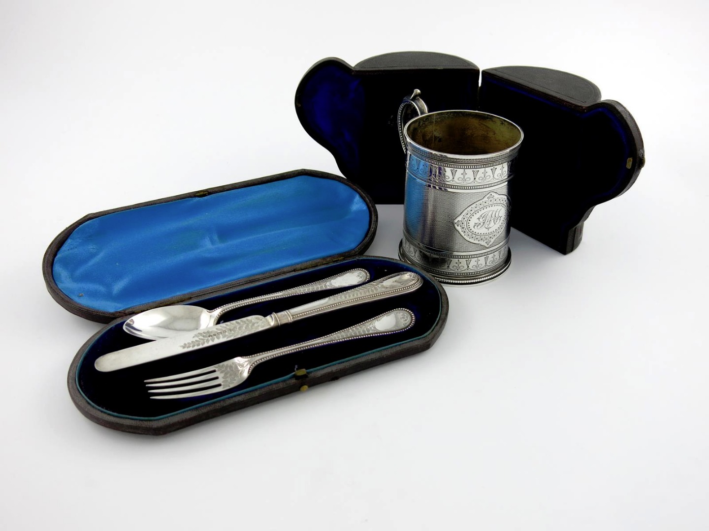 circular form, with a scroll handle, engine turned and bright-cut decoration, initialled, in a fitted case, height 9cm, plus a Victorian silver three-piece christening set, by Martin, Hall & Co, the knife Sheffield 1876, the spoon and fork London 1876, beaded borders, engraved fern leaf decoration, in a fitted case, approx. weighable 7.4oz. (2)