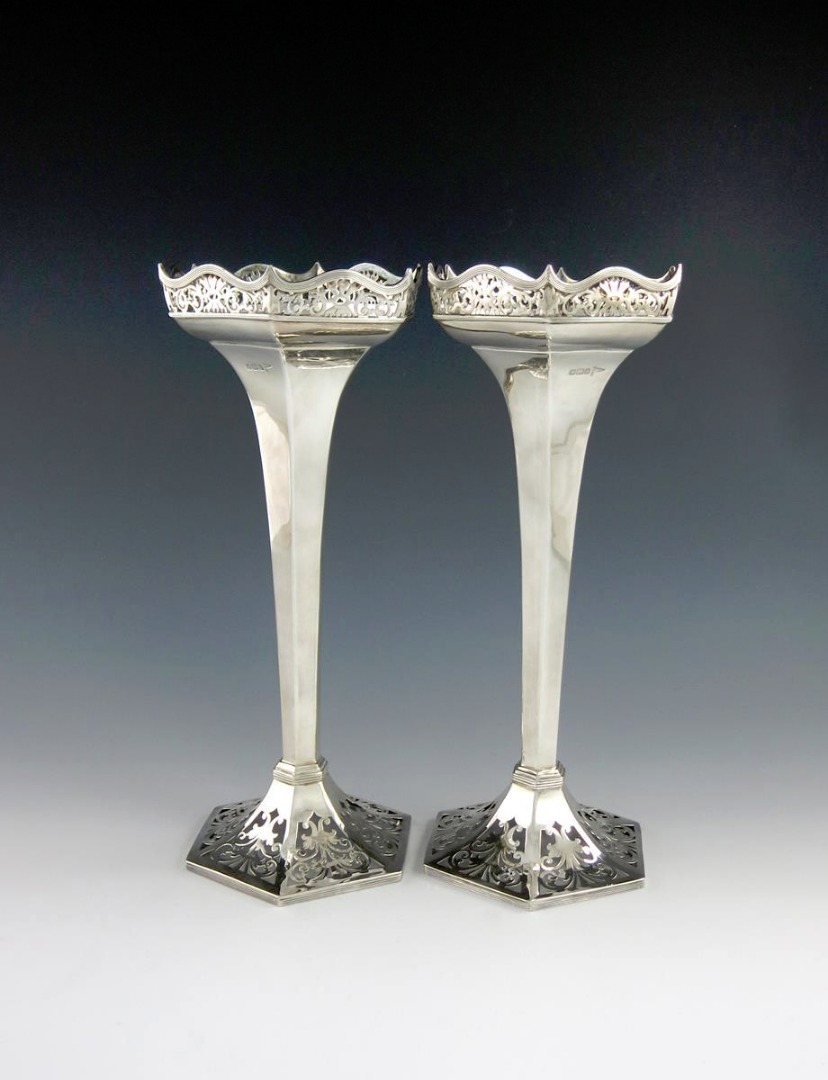 tapering hexagonal form, pierced foliate scroll decoration, wavy-edge border, on raised pierced hexagonal bases, height 30.4cm, approx. weight 22oz. (2)