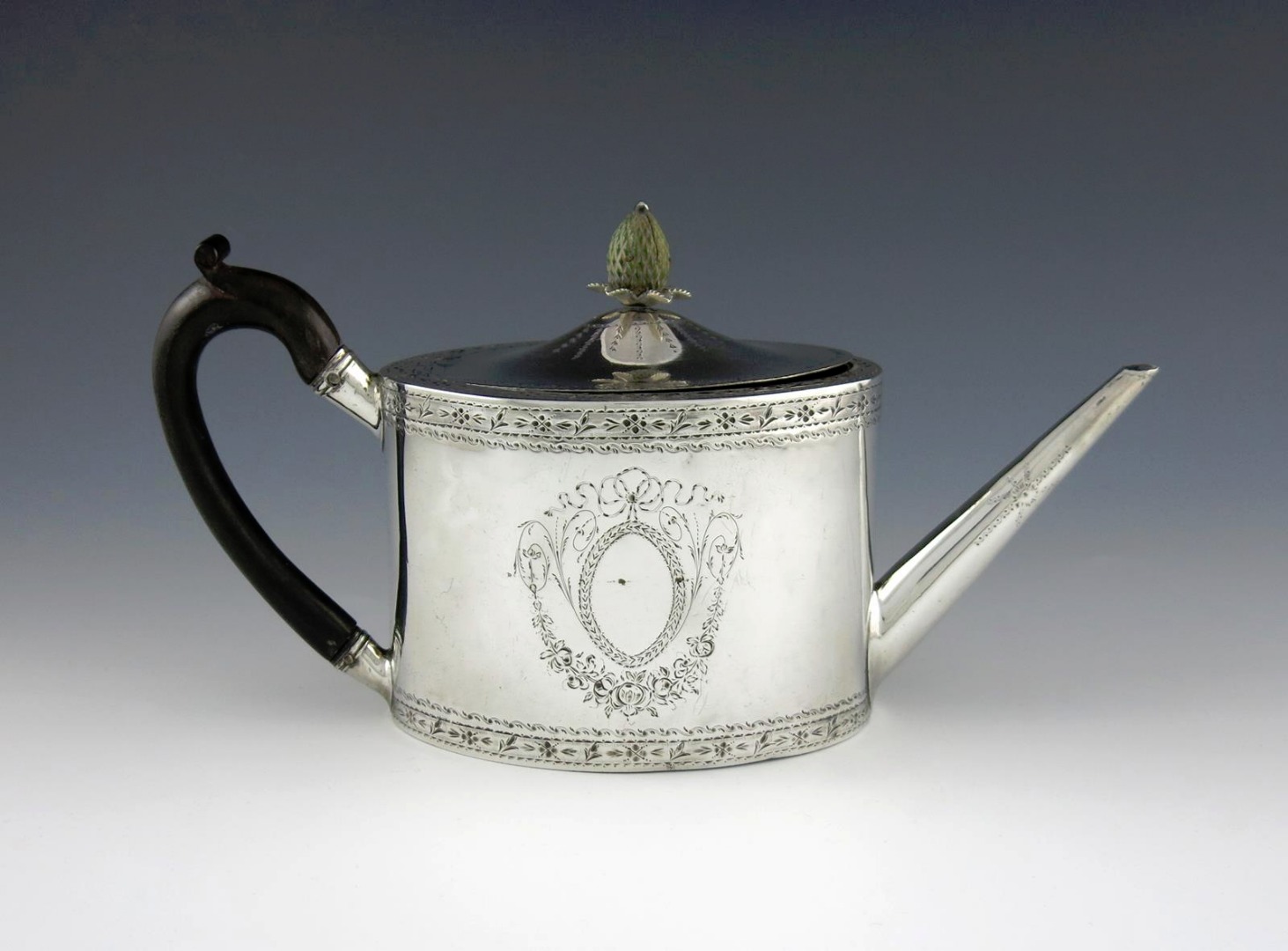 oval form, with bright cut decoration, with two vacant cartouches, stained green ivory pineapple finial and wooden scroll handle, length handle to spout 28cm, approx. weight 12.6oz.