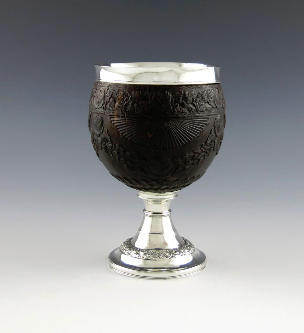 the circular coconut bowl with carved decoration with garlands of flowers, plain mount, on a raised circular foot with a foliate scroll border, height 16.3cm.
