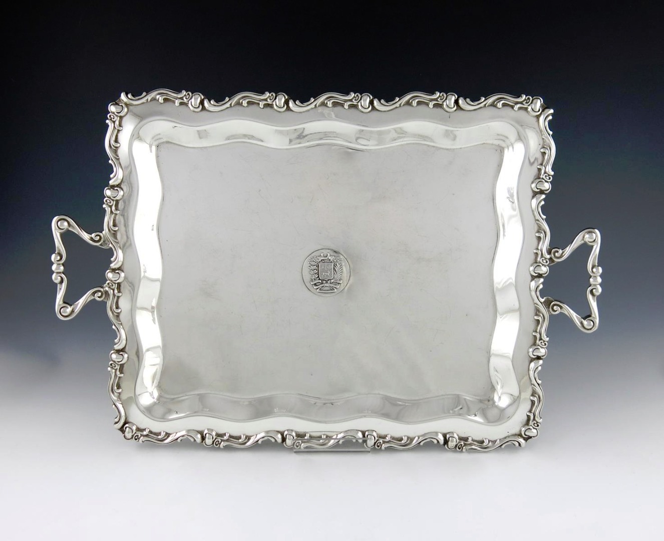 rectangular form, foliate scroll borders and handles, the centre with the coat of arms of Venezuela, length handle to handle 44.5cm, approx. weight 25.8cm.