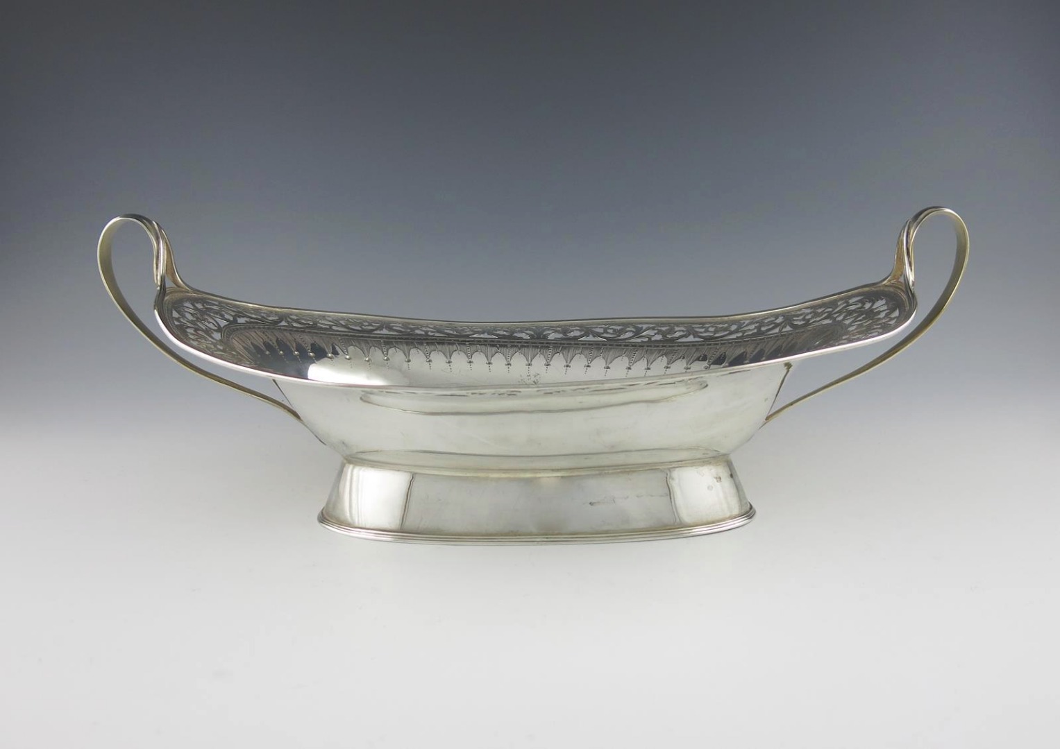 oval form, bifurcated scroll handles, pierced and engraved foliate scroll border, on a raised oval foot, reeded border, length 42cm, approx. weight 24oz.