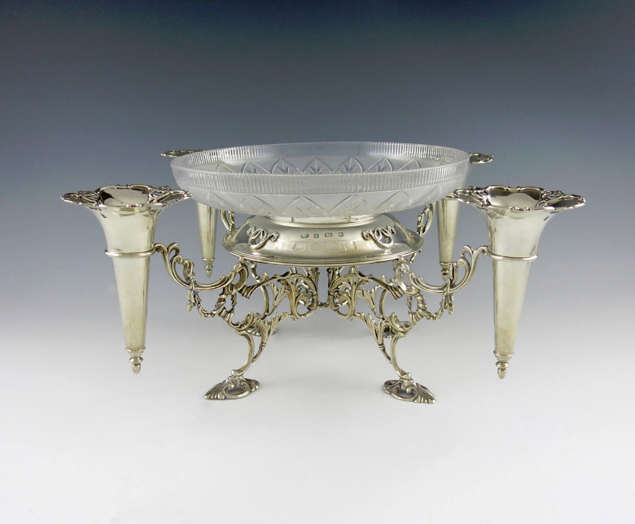 circular form, pierced decoration, with four pieced foliate scroll arms, each supporting a tapering trumpet vase, pierced border, with a central cut glass bowl, length 37cm, approx. weight 23oz.