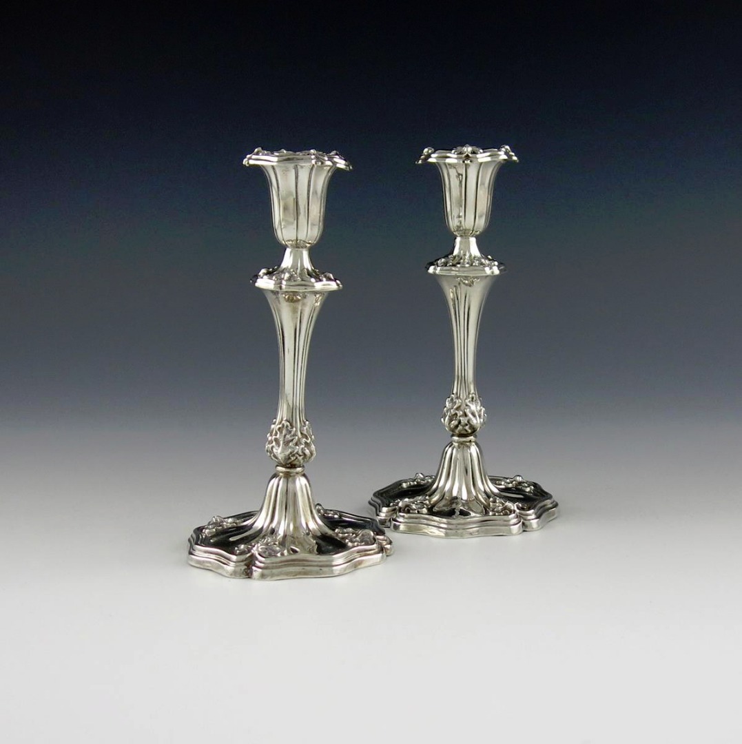 tapering baluster stems, foliate shoulders, detachable drip pans, on shaped circular bases with foliate motifs, height 14cm. (2)
