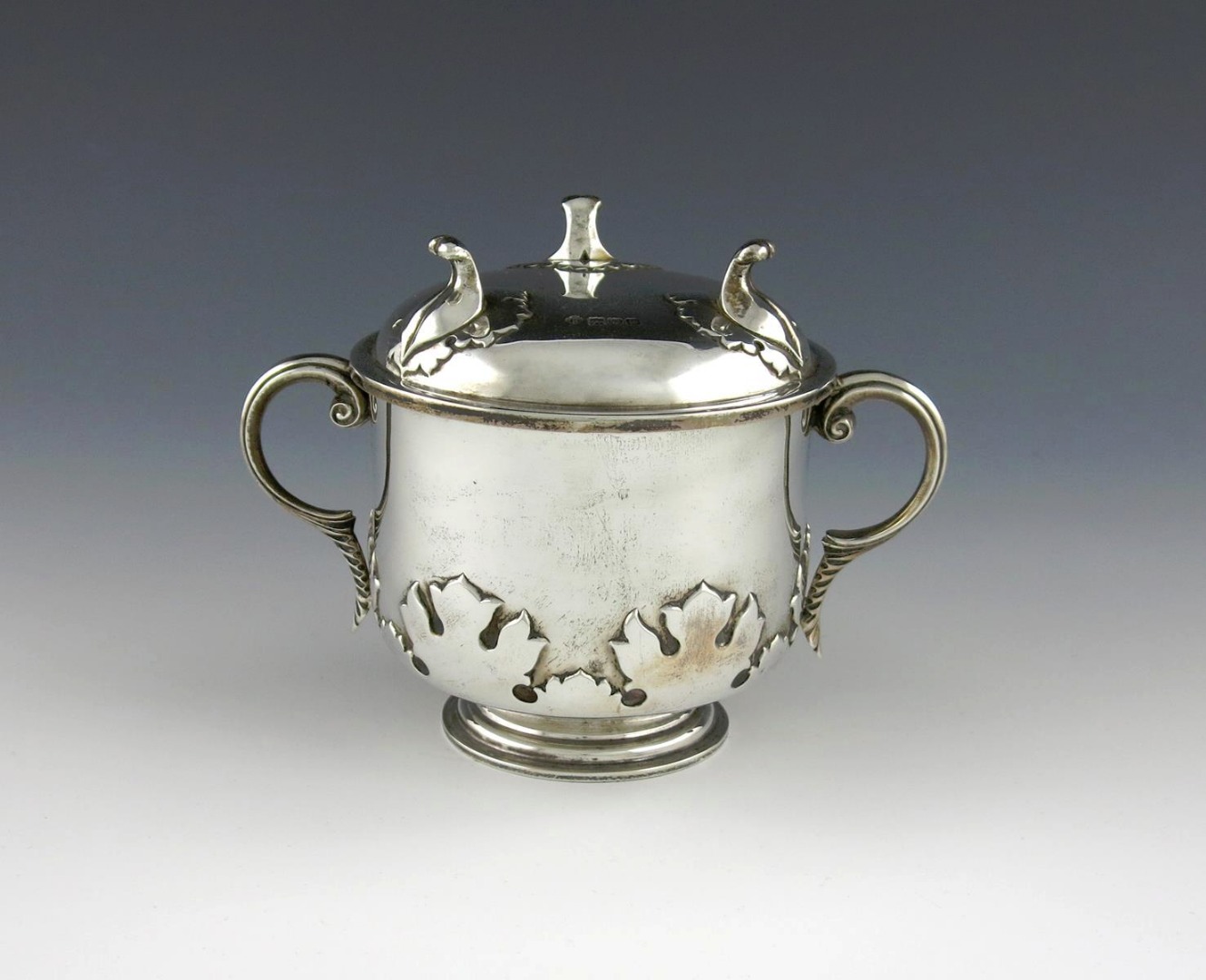 in the Charles II manner, circular form, scroll handles, cut-card decoration, the cover with three scroll feet, inscribed, height 13cm, approx. weight 17oz.