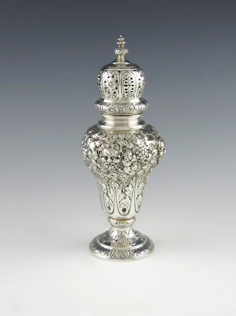 baluster form, embossed foliate decoration and Bacchus masks, on a matted background, pull-off pierced cover, on a raised circular foot, height 24cm, approx. weight 12oz.