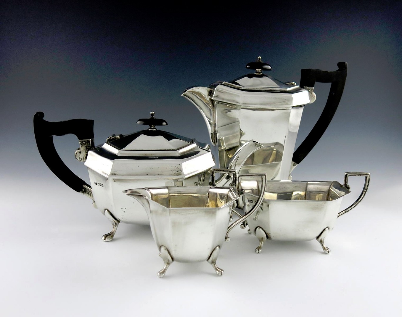 tapering rectangular form, canted corners, scroll handles, on ball and claw feet, length of tea pot handle to spout 27cm, approx. weight 53.7oz. (4)