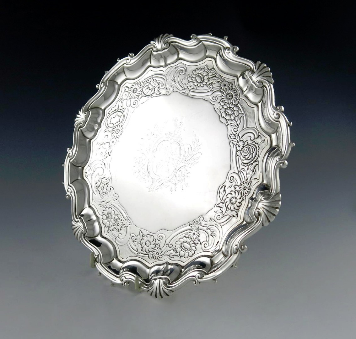 circular form, shell and scroll border, chased foliate scroll decoration, on three hoof feet, the centre with an armorial, diameter 26.8cm, approx. weight 19.5oz.