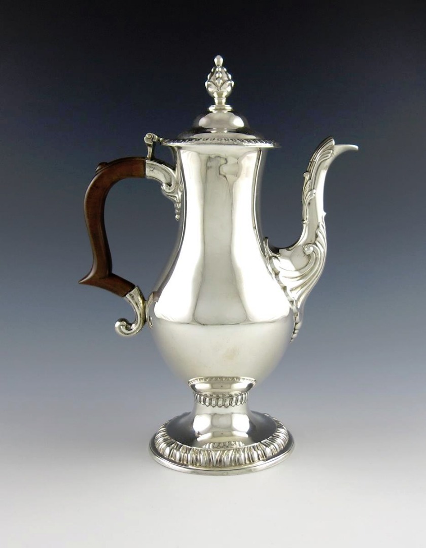 baluster form, scroll handle, scroll capped spout, domed cover, gadroon borders, on a raised circular foot, height 28.5cm, approx. weight 23.5oz.