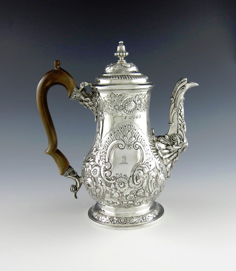 baluster form, chased foliate scroll decoration, scroll handle, the domed cover with fluted and floral decoration, on a circular foot, engraved with a crest, height 24cm, approx. weight 30.9oz.