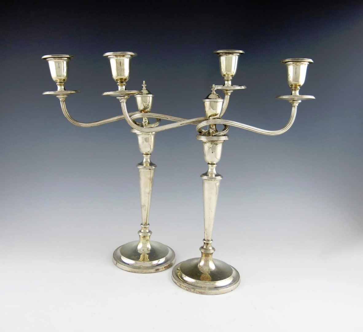 tapering circular columns, reeded borders, reeded scroll arms supporting an urn shaped capital, and with a central urn finial, on a raised circular foot, height 37.3cm. (2)
