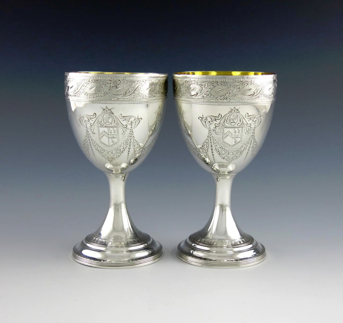 plain urn form, on a raised circular foot, engraved foliate decoration and crest, height 16cm, approx. weight 12oz. (2)