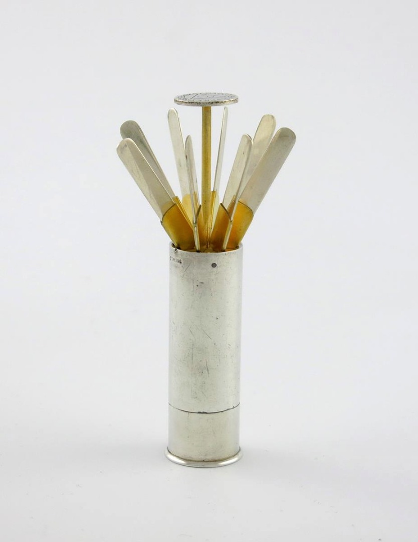 modelled as a cartridge, the base turns to produce eight numbered markers, the top engraved with a '6' in a triangle and ' Loaded by Asprey Smokeless', height open 10.2cm, height closed 6cm.