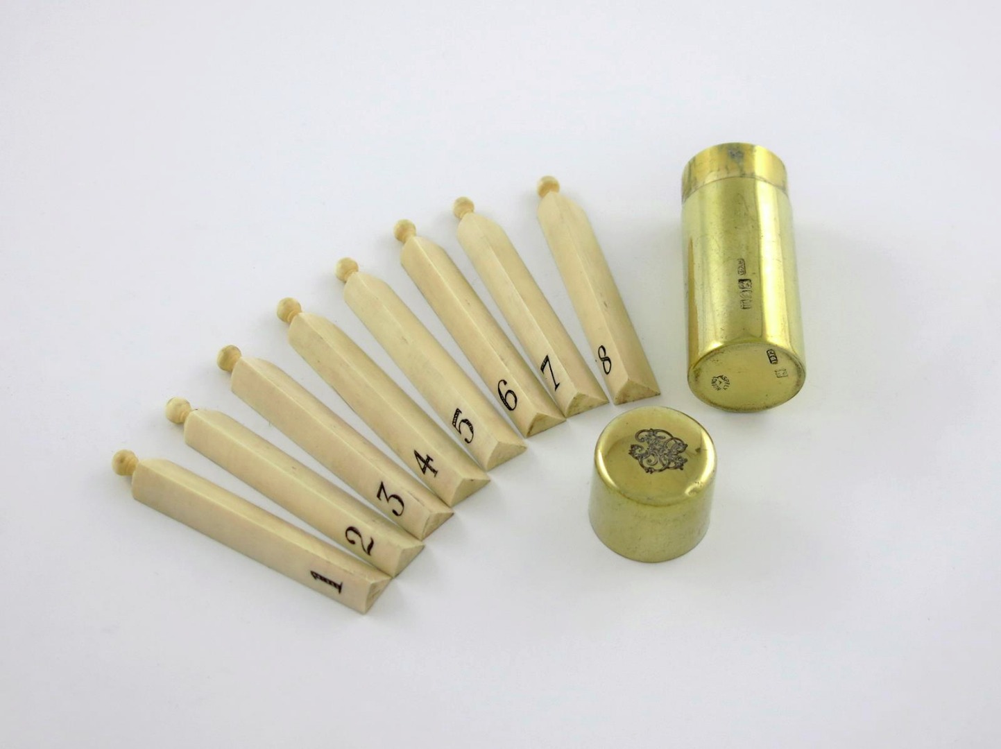 plain cylindrical form, the pull-off cover with a monogram, the interior with eight numbered ivory pegs, height 7cm, approx. weight 1oz.