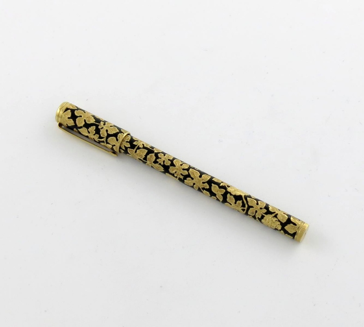 slender cylindrical form, decorated with flowers on a black enamel ground, the pull-off cover with a clip,( fits Parker refills), length, gross weight 38.5g.