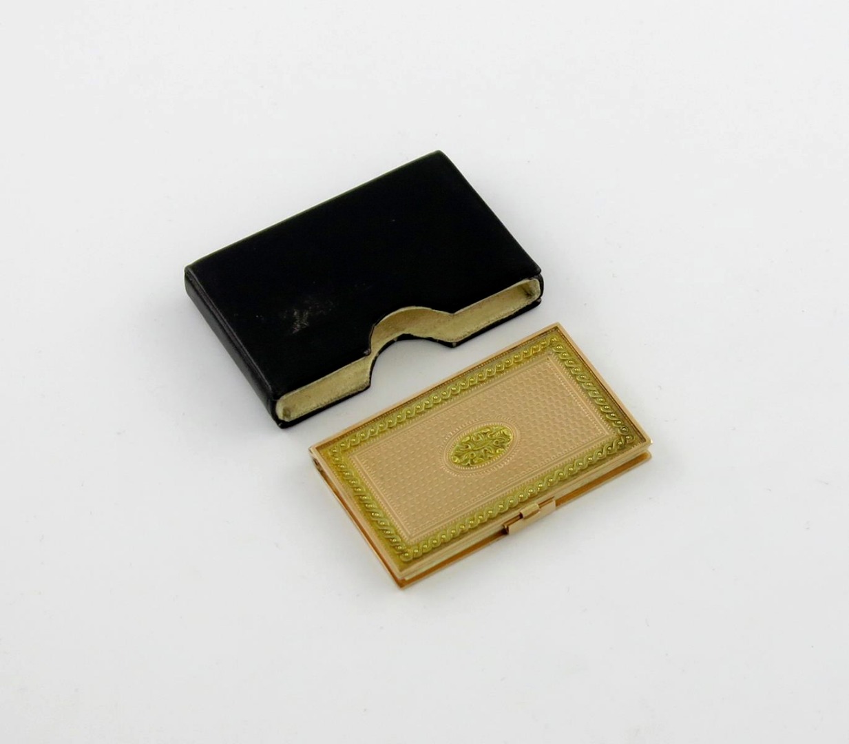 rectangular book form, engine-turned decoration, foliate and stylised borders, the interior with loose ivory sheets, in a leather case, length 5.8cm, approx. weight 33g.